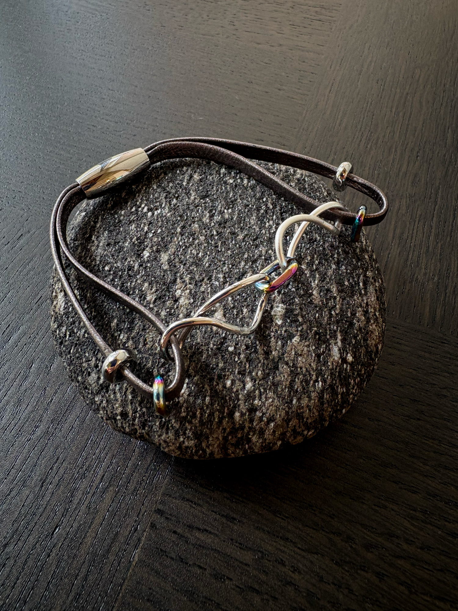 자석 잠금이 있는 가죽 팔찌입니다.