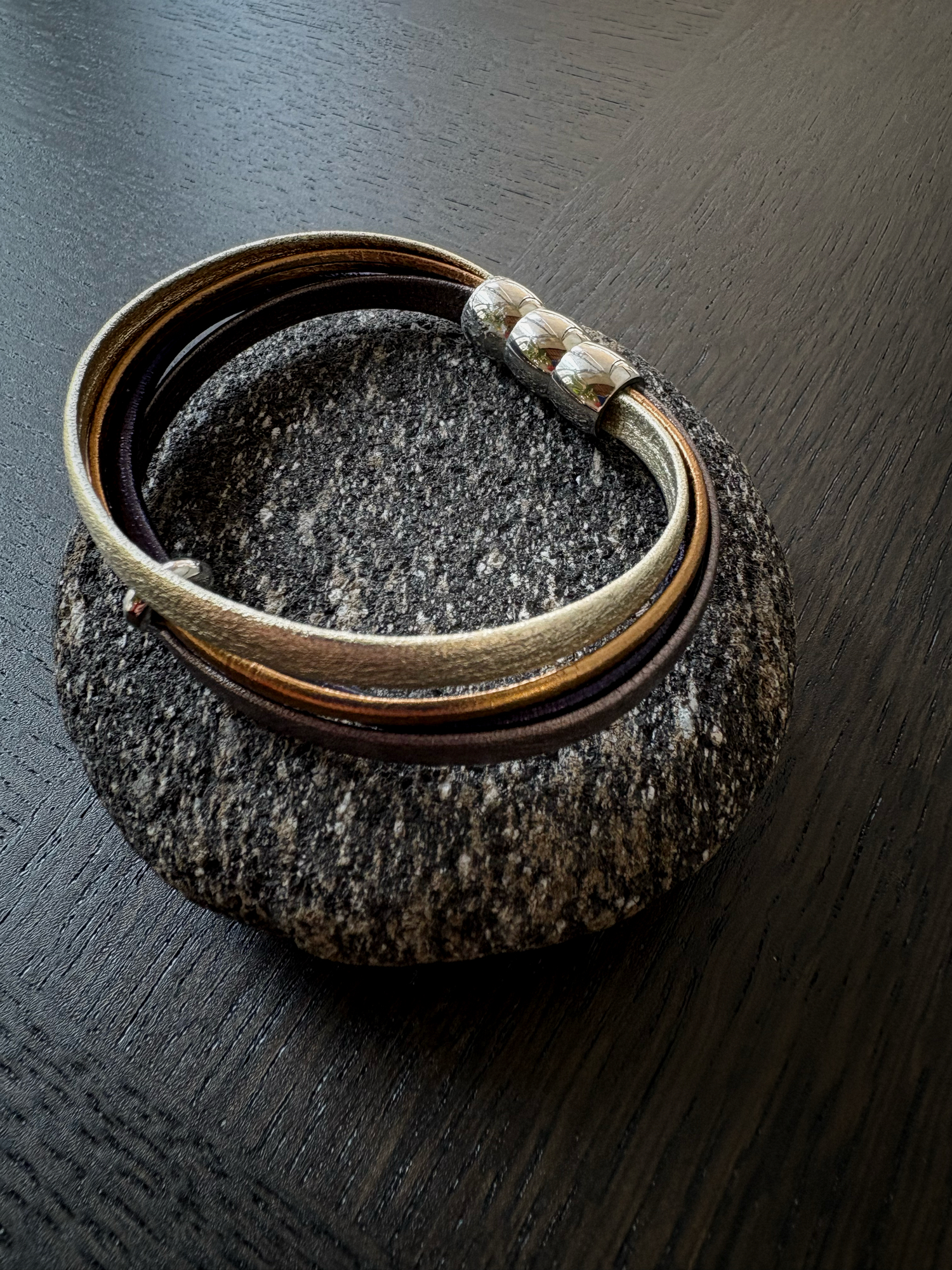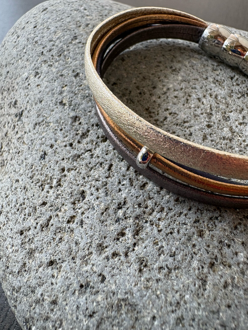 자석 잠금이 있는 가죽 팔찌입니다.