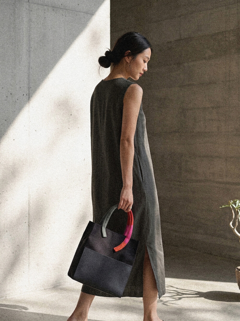 앞뒤를 감싸는 가죽이 자연스럽게 큰 포켓으로 기능합니다. 미니백보다 약간 더 큰 사이즈고 안감이 없어 가벼운 가방입니다. 내부에 스트랩을 연결할 수 있는 고리가 있습니다. (스트랩 별매)