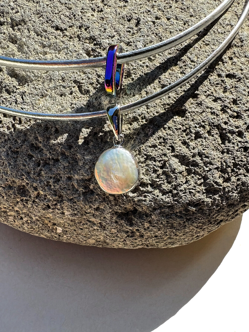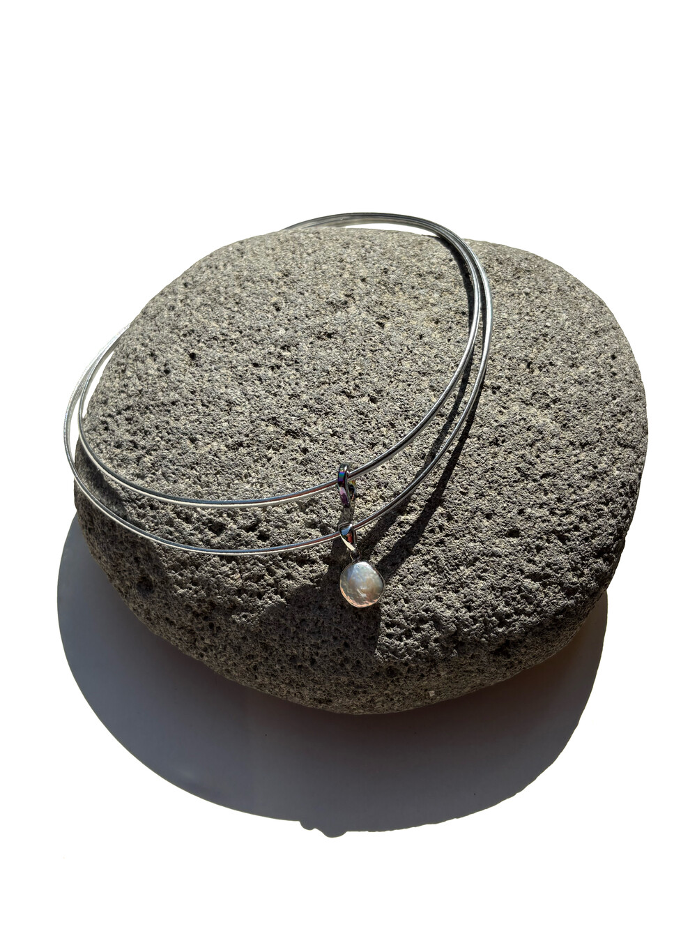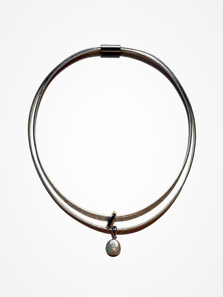 가벼운 가죽과 금속으로 만든 목걸이입니다. 자석 잠금으로 쉽게 착용할 수 있습니다.