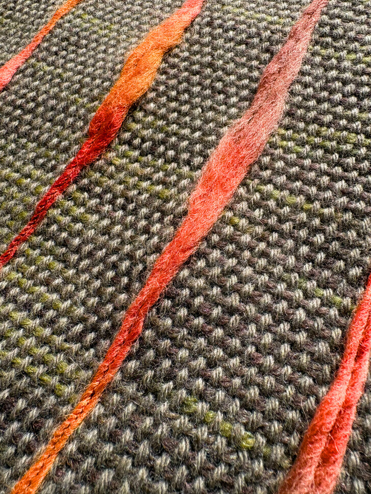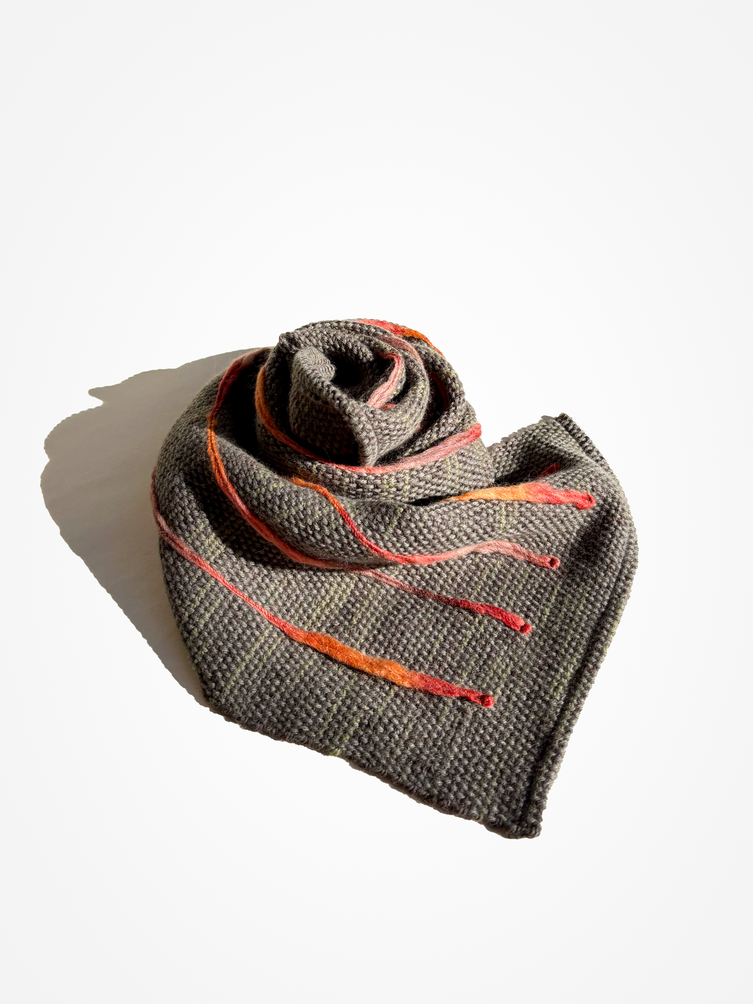 울과 알파카를 직조하여 울 스티치가 포인트로 들어간 짧은 머플러입니다. 베이스는 미묘한 초록빛이 느껴집니다. 가볍게 한번만 묶는 스타일을 추천합니다.