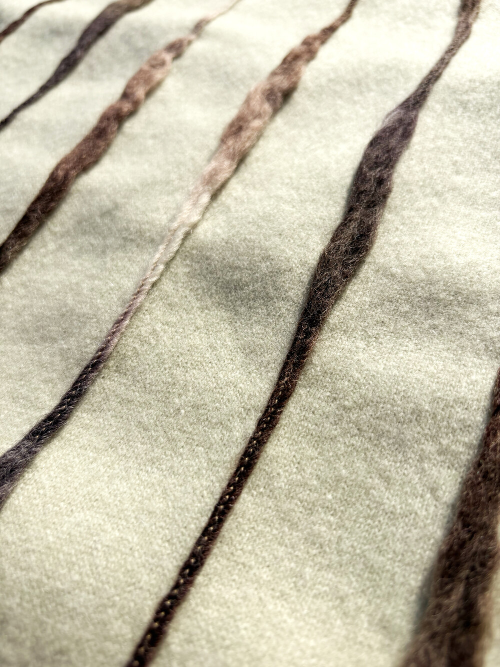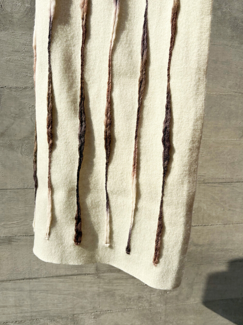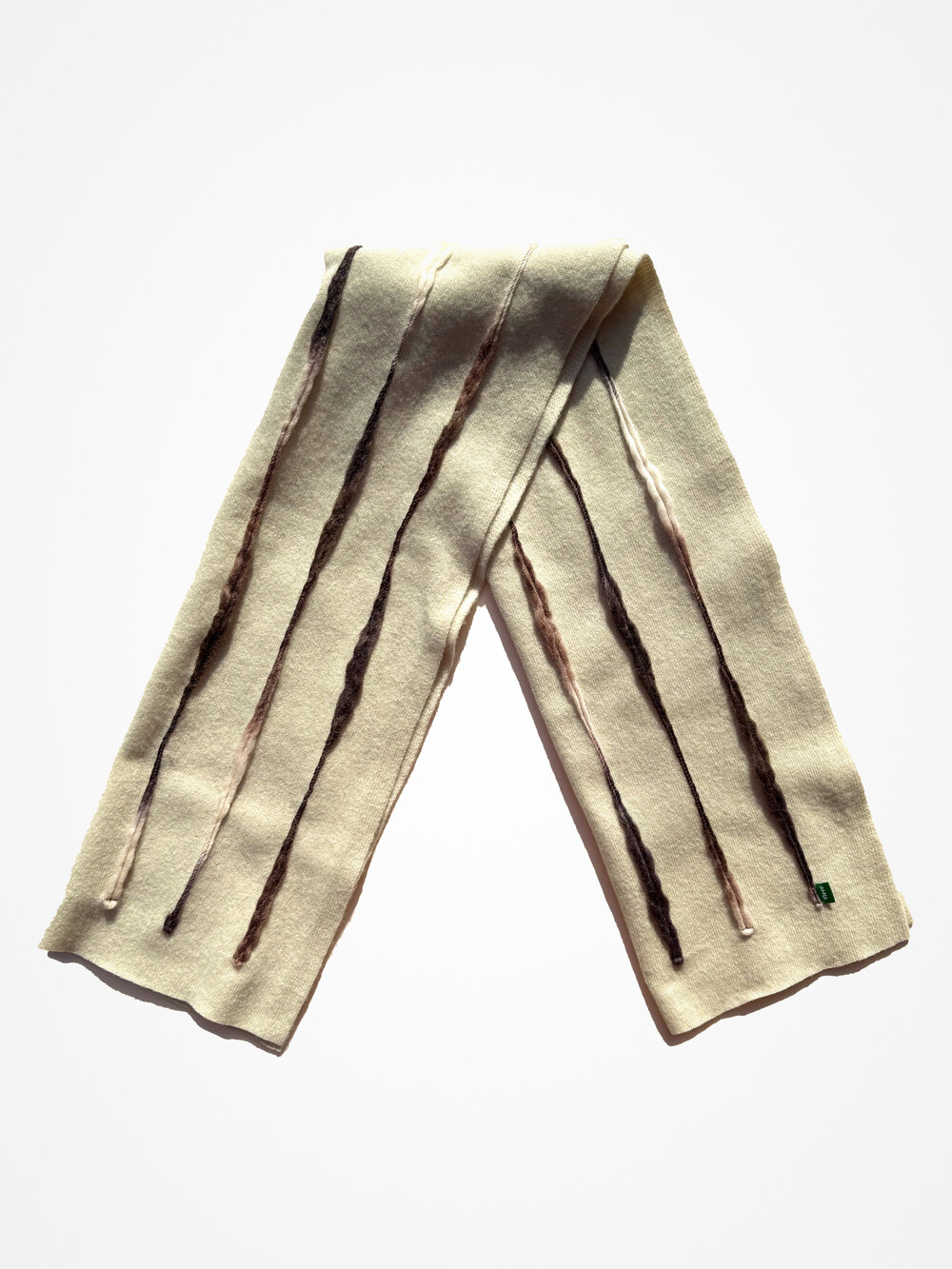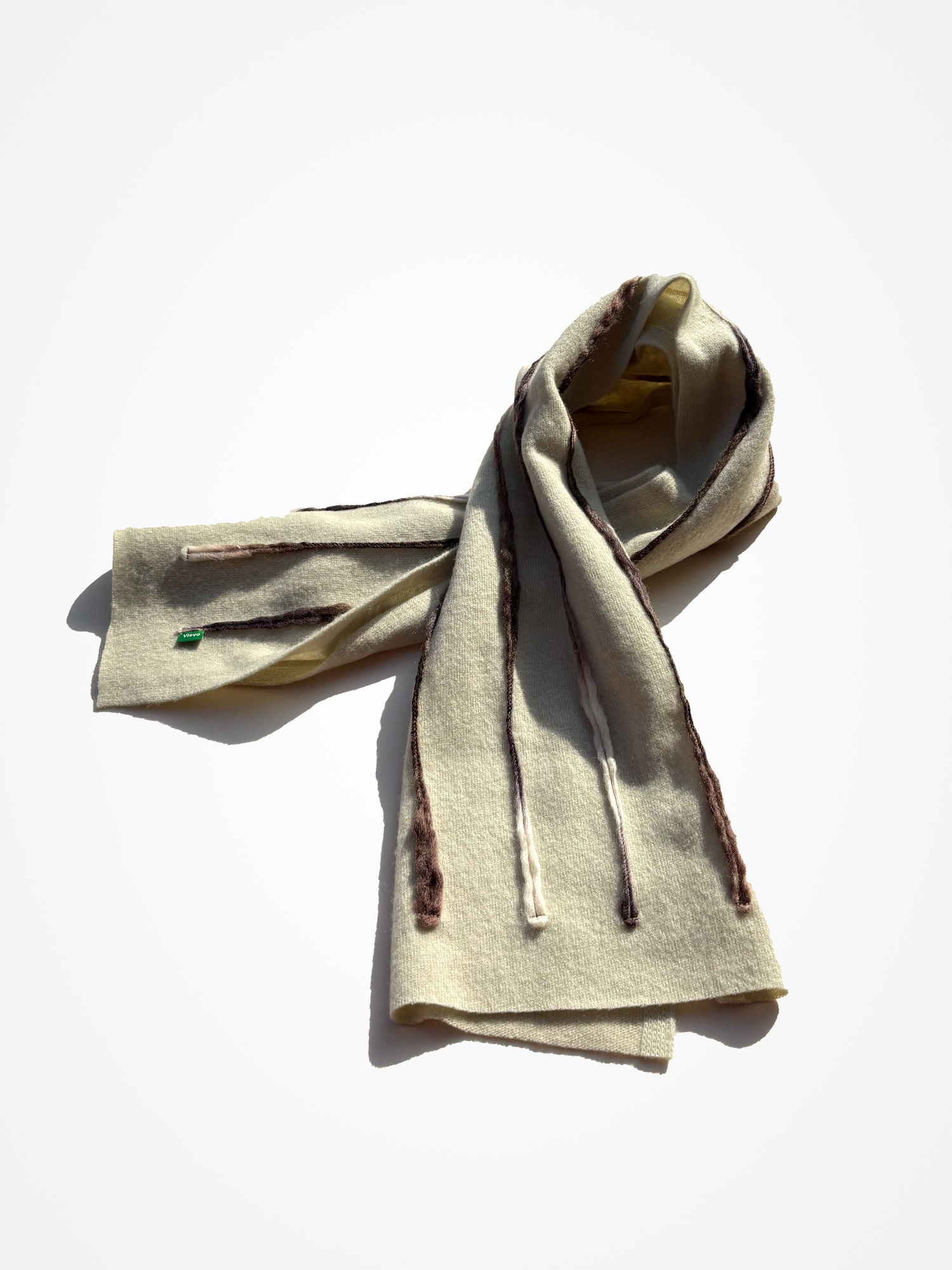 캐시미어와 울로 만든 짧은 머플러입니다. 앞면은 라인 스티치, 뒷면은 무지로 다양하게 연출할 수 있습니다. 가볍게 한번만 묶는 스타일을 추천합니다.