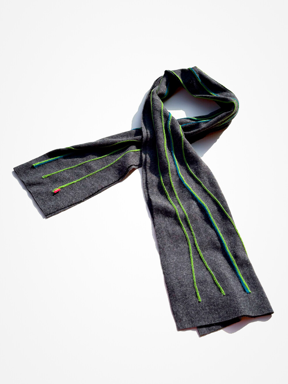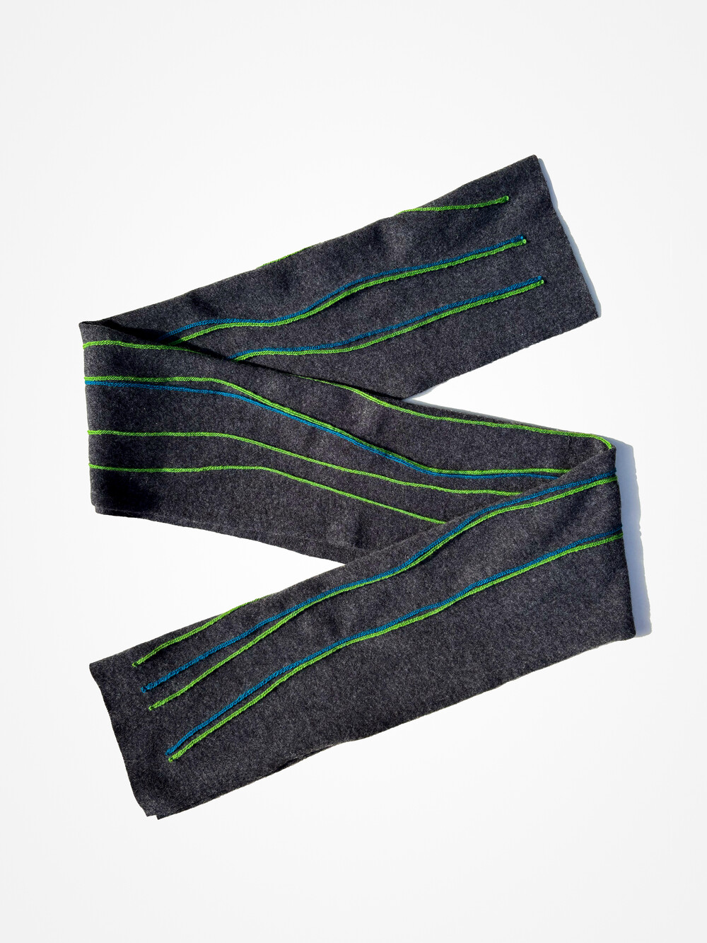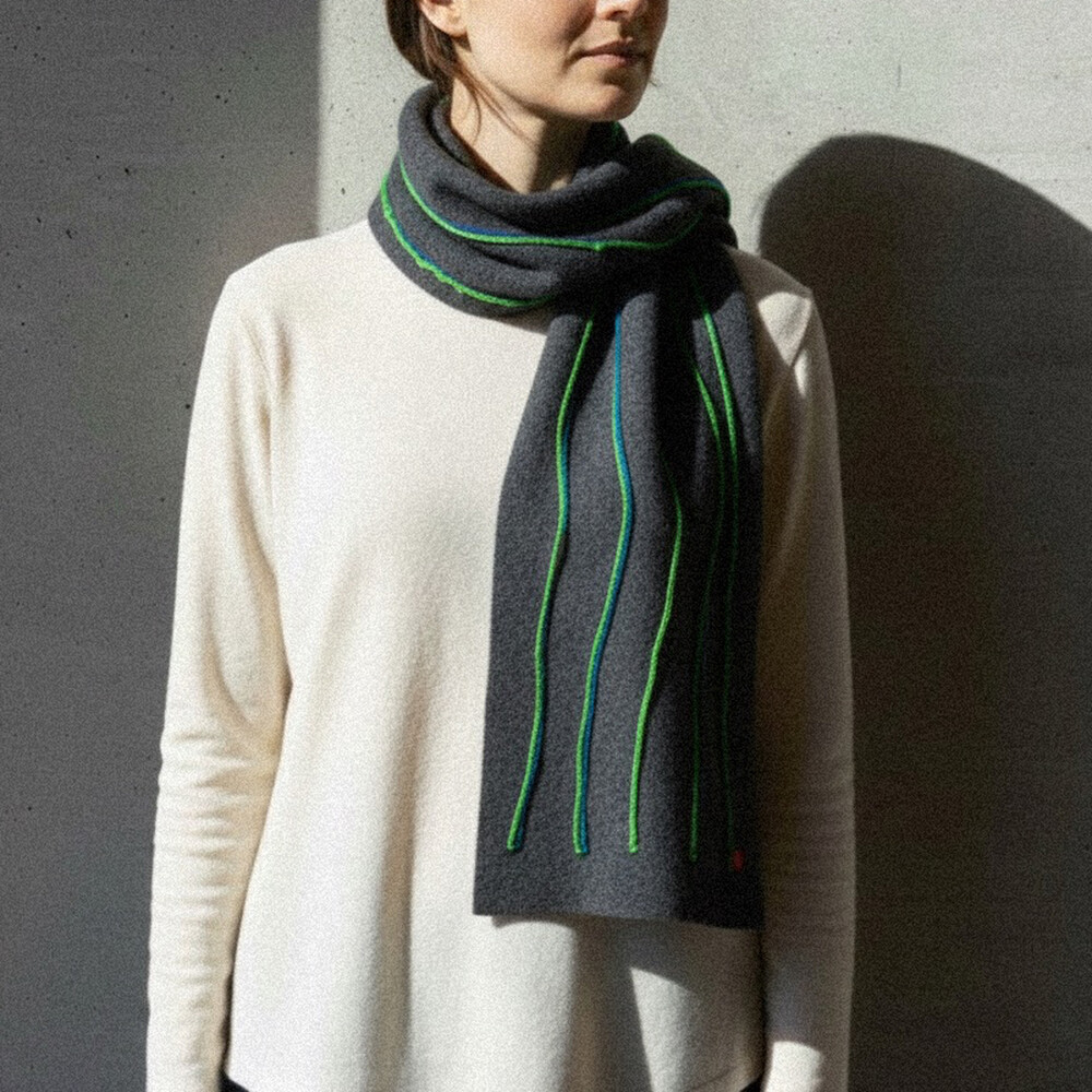 캐시미어와 울로 만든 긴 머플러입니다. 앞면은 라인 스티치, 뒷면은 무지로 다양하게 연출할 수 있습니다. 가볍고 여유있는 사이즈입니다.