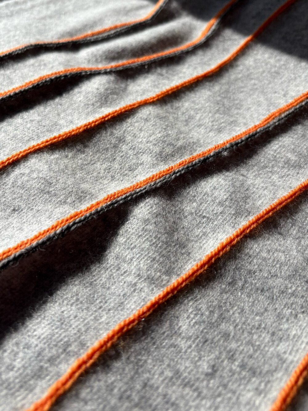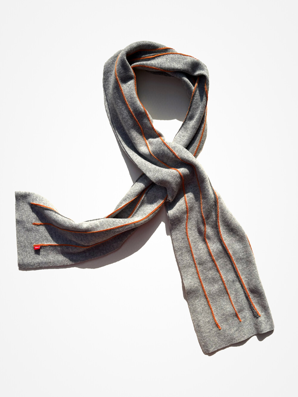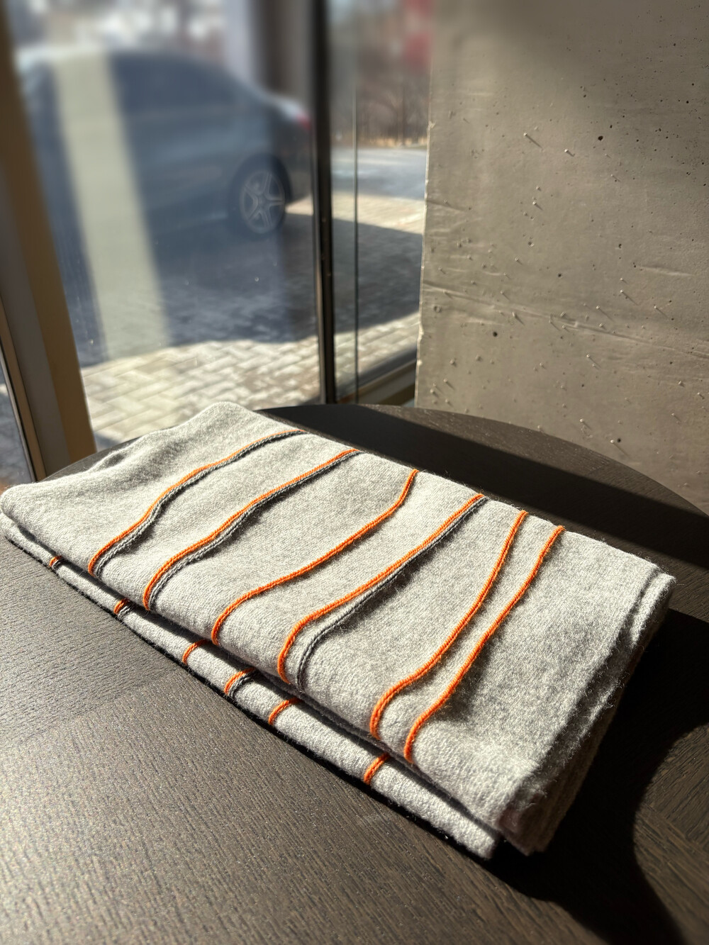 캐시미어와 울로 만든 긴 머플러입니다. 앞면은 라인 스티치, 뒷면은 무지로 다양하게 연출할 수 있습니다. 가볍고 여유있는 사이즈입니다.