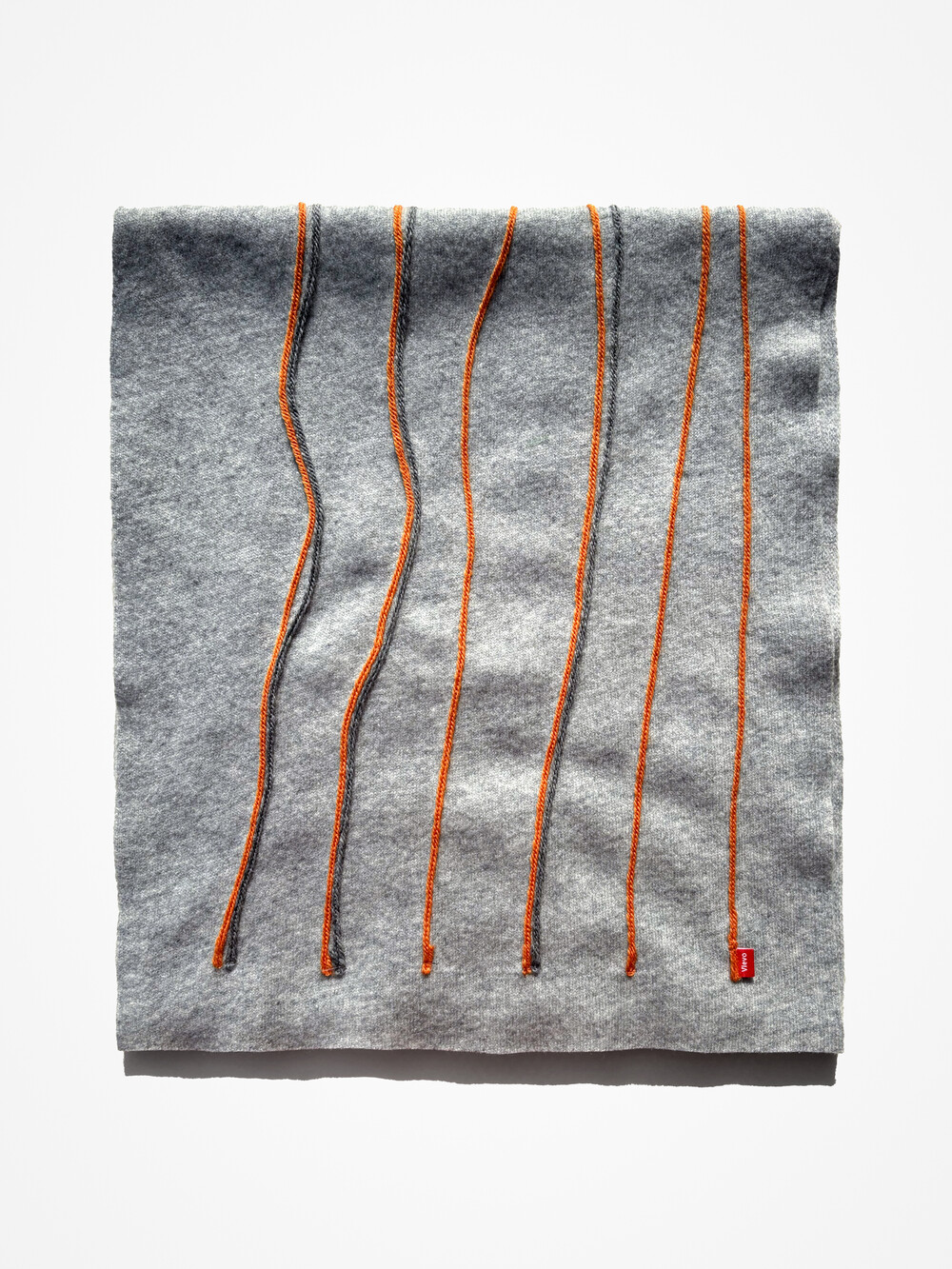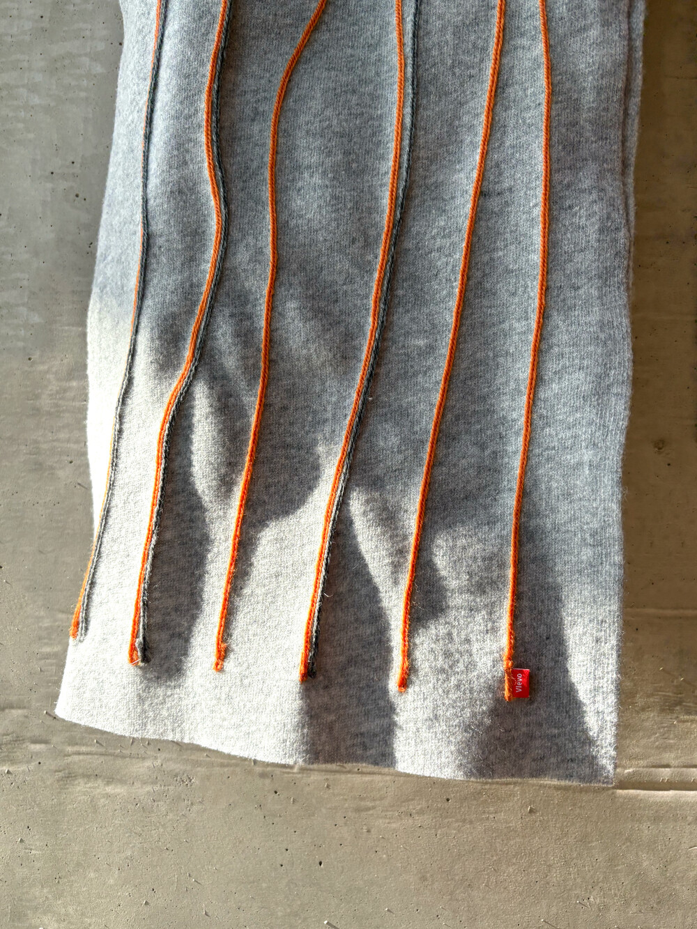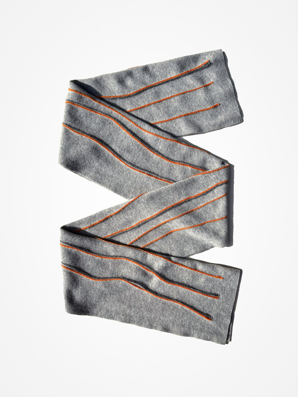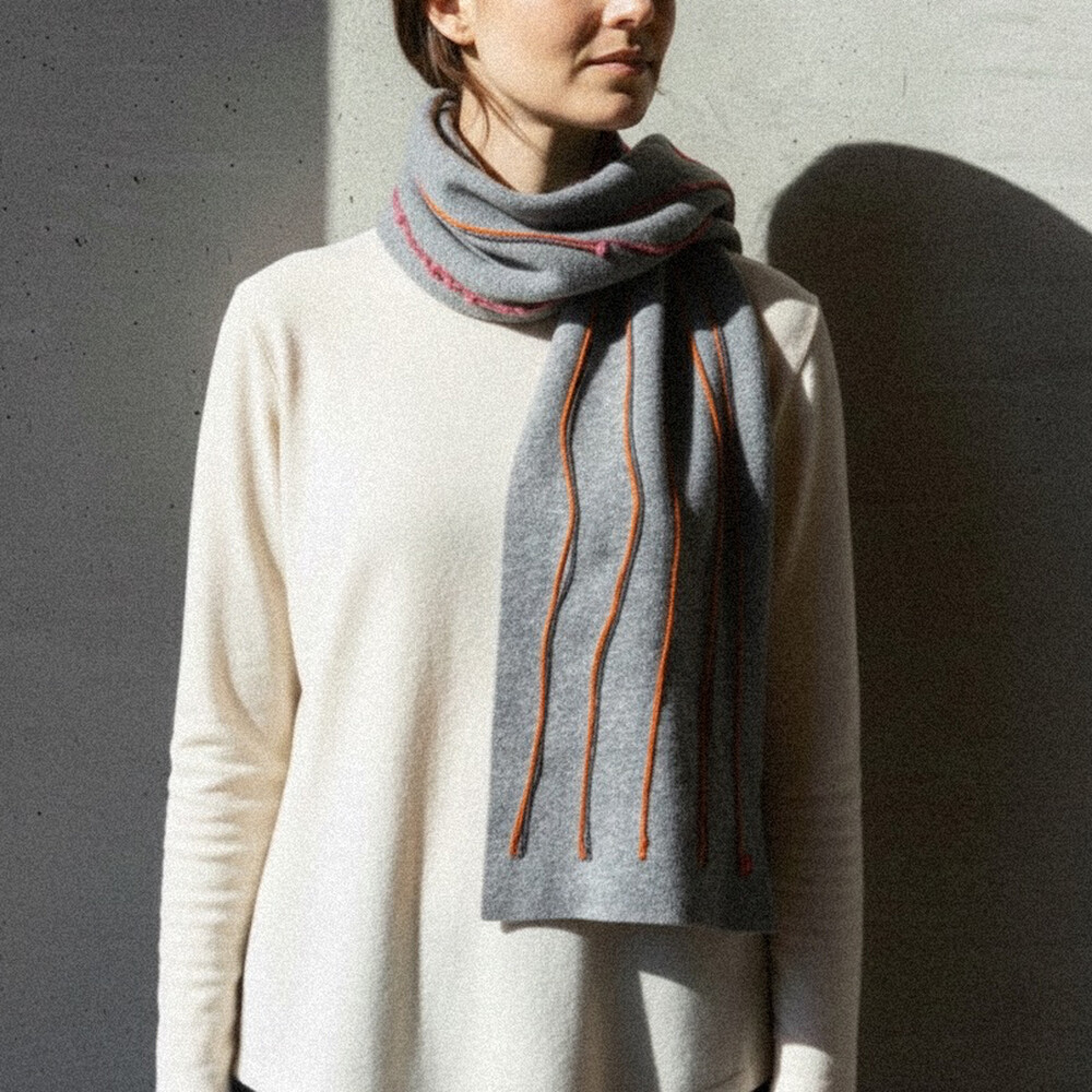캐시미어와 울로 만든 긴 머플러입니다. 앞면은 라인 스티치, 뒷면은 무지로 다양하게 연출할 수 있습니다. 가볍고 여유있는 사이즈입니다.