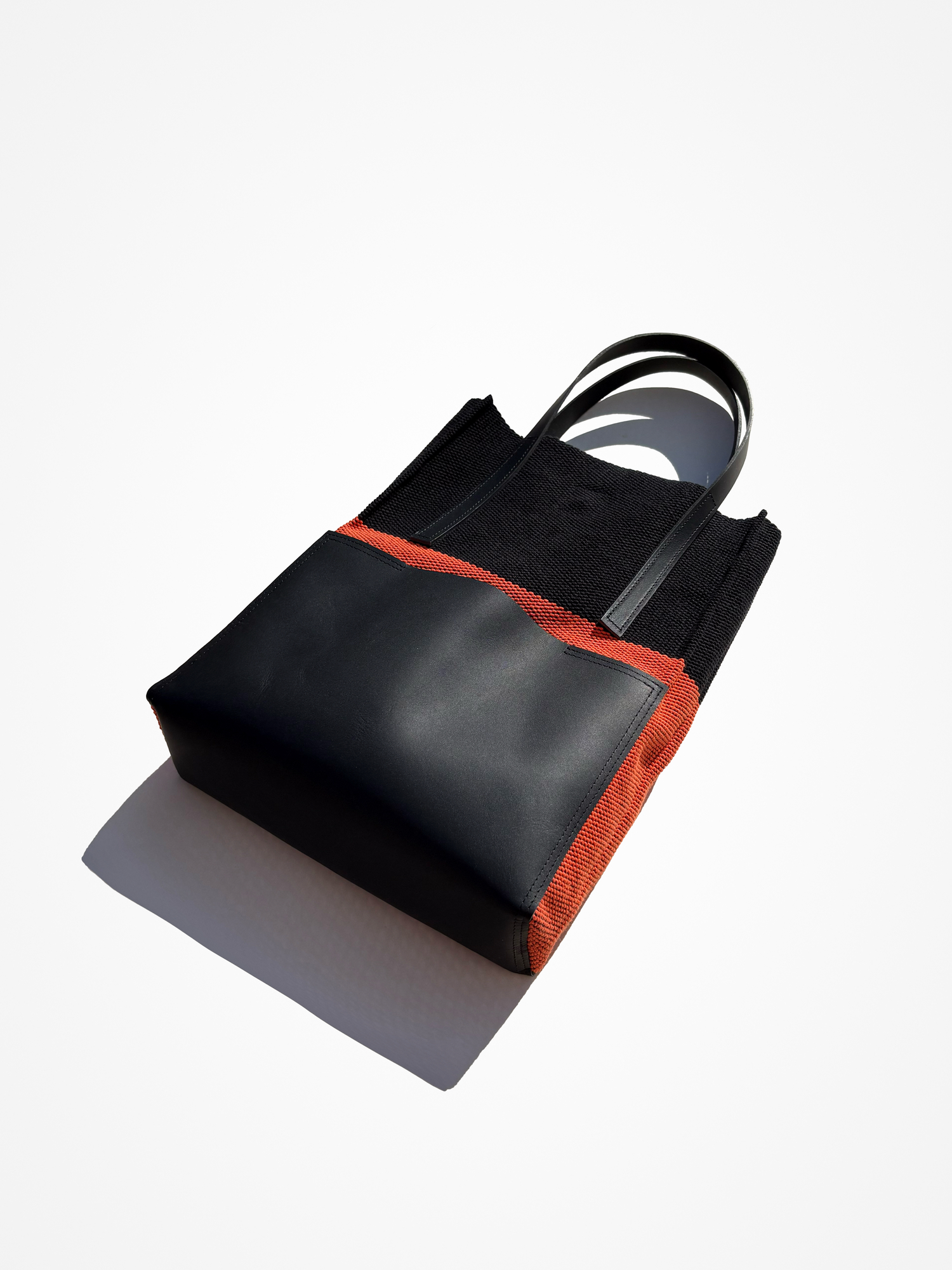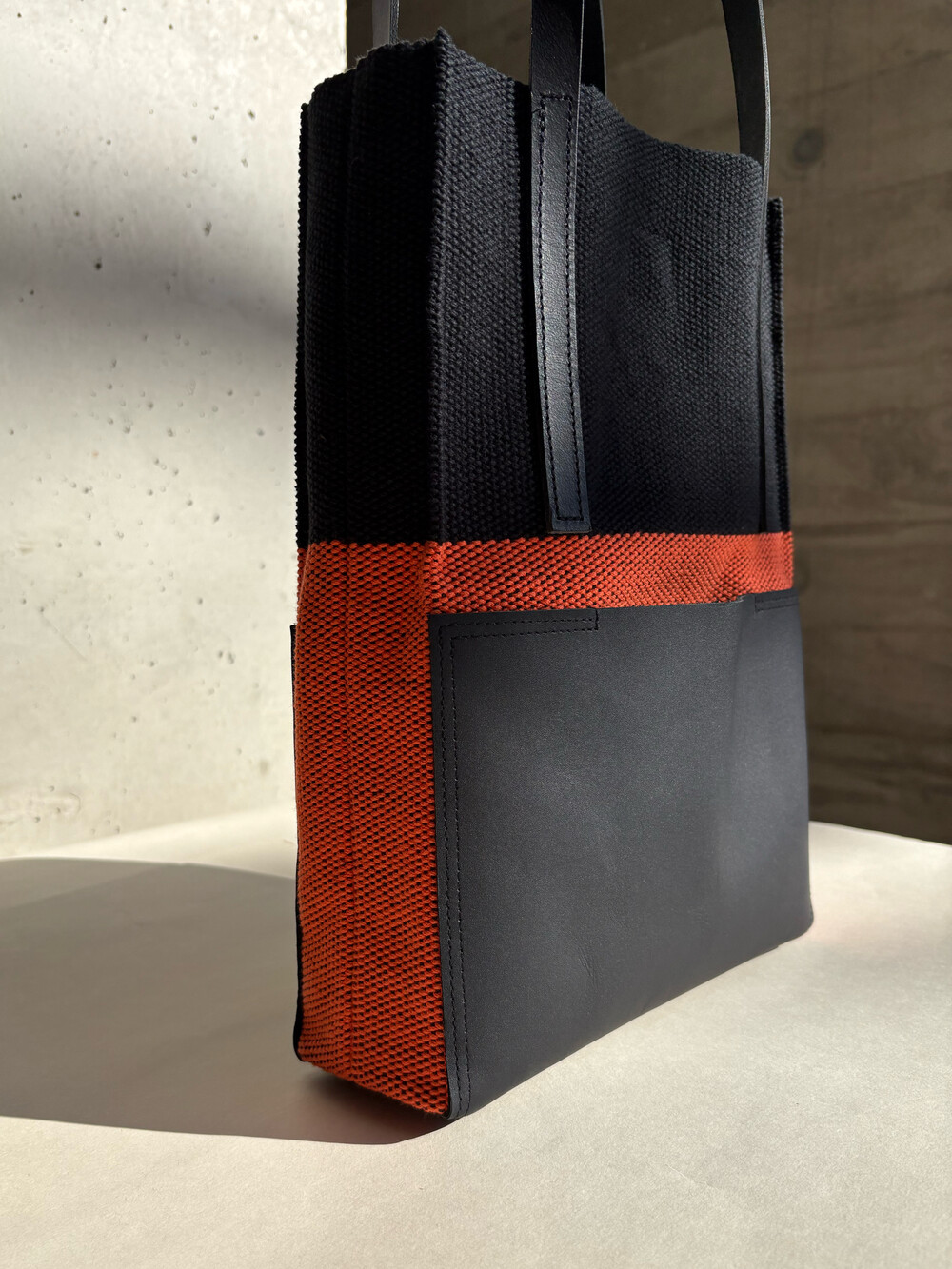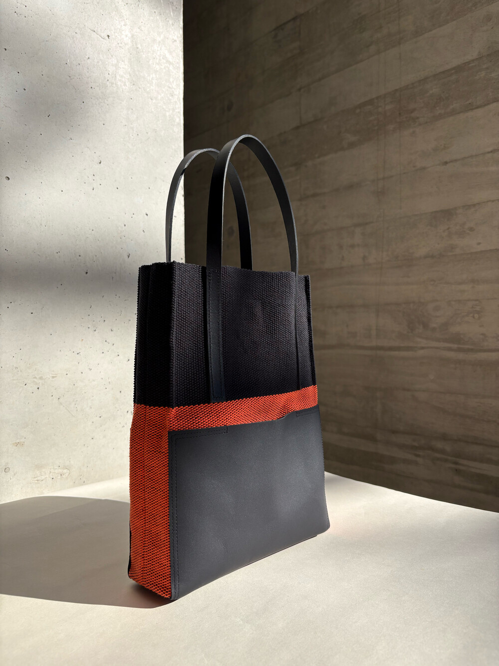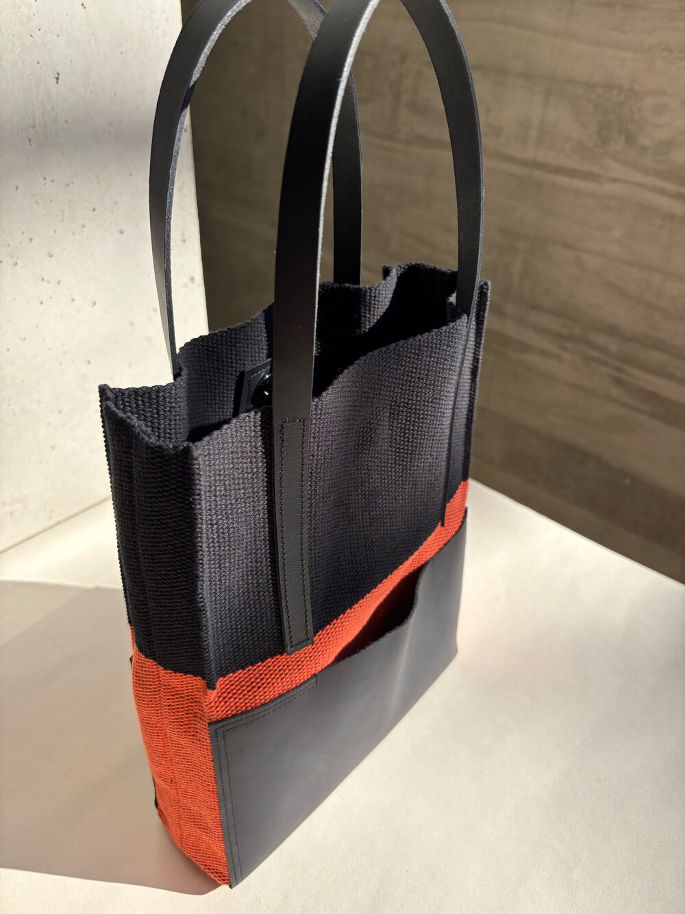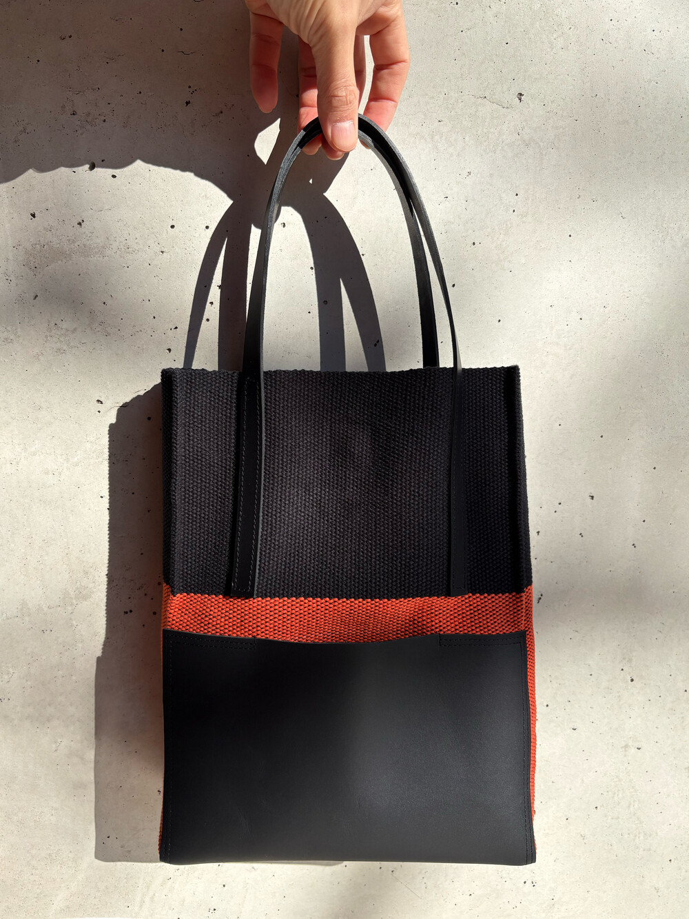 콤팩트한 사이즈의 수직 토트백입니다. 앞뒤에 자연스럽게 연결되는 가죽 포켓과 내부 포켓, 자석 잠금이 있습니다.