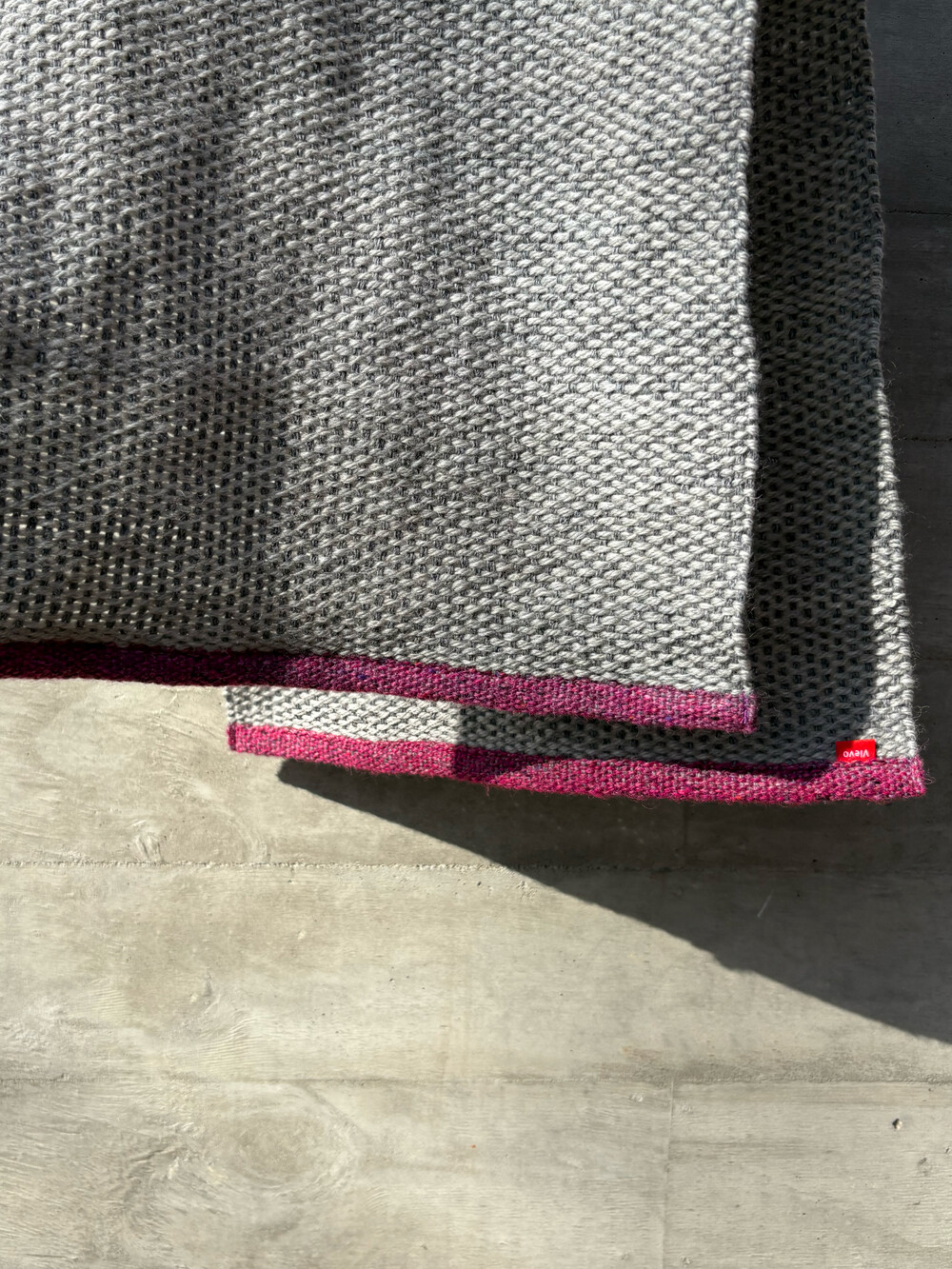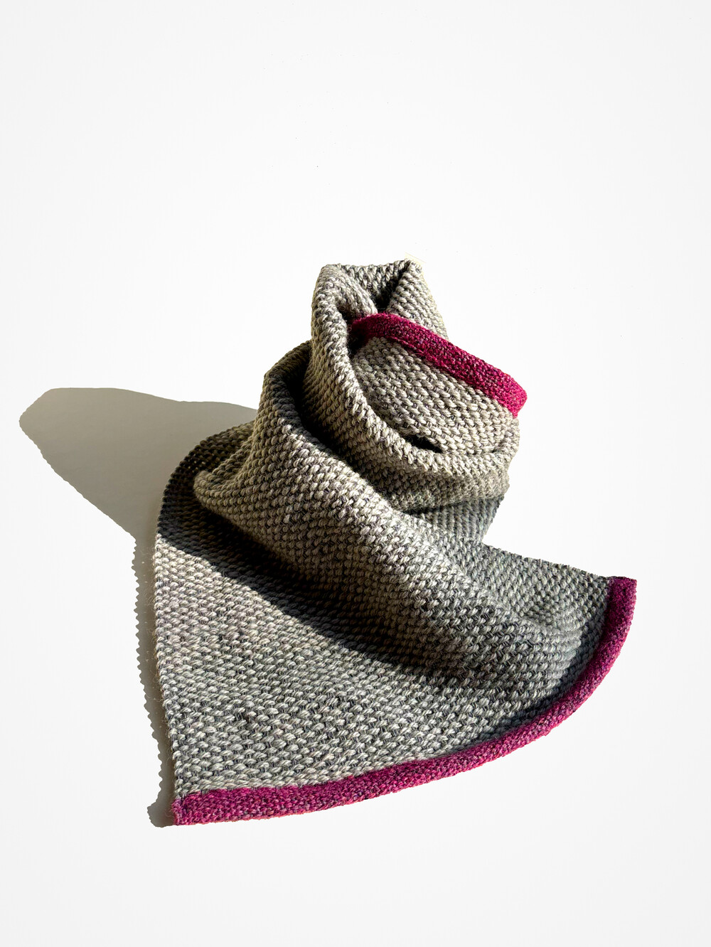 울과 알파카를 직조한 짧은 머플러입니다. 베이스는 실버톤이고 끝단은 마젠타로 마감했습니다. 가볍게 한번만 묶는 스타일을 추천합니다.